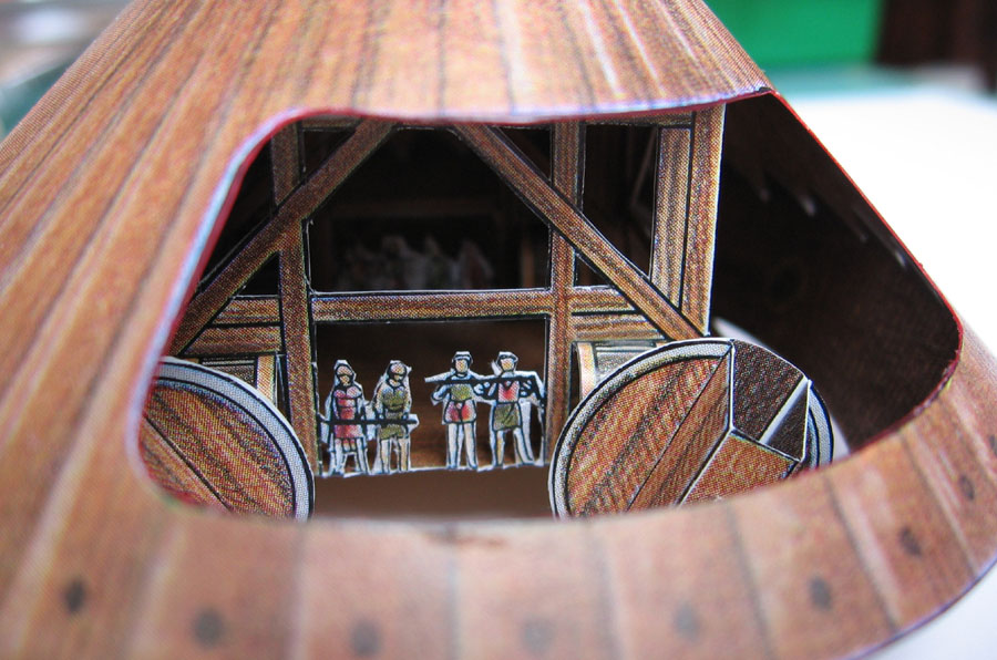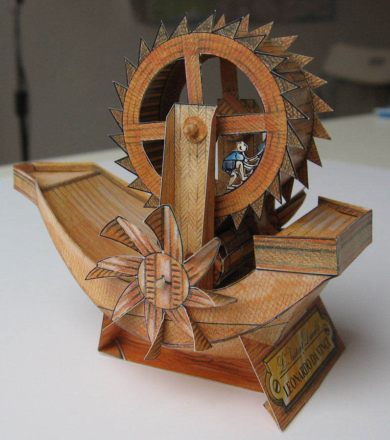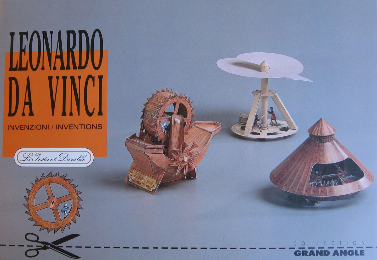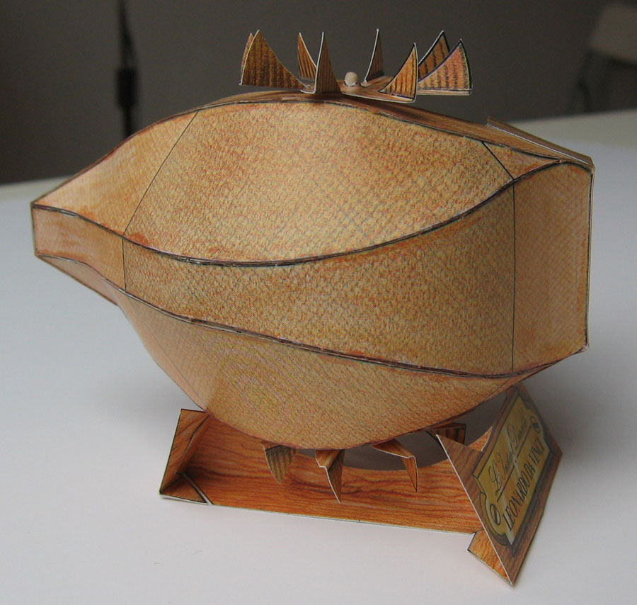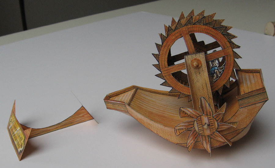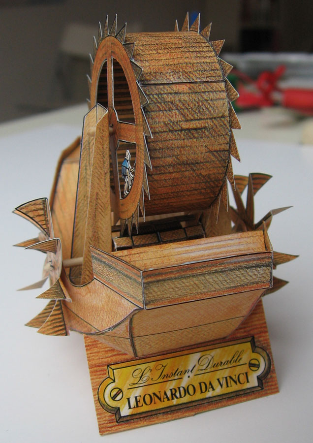 The models are typical L'Instant-style, i.e. good graphics and good-quality cardboard coupled with some curious (i.e. sometimes ingenious, sometimes just, well, curious...) construction techniques, but for an engineer like me the da Vinci models are a "must have built", of course. And to do them justice, these three are very neat constructions. Alas, they have one problem: They all rely on printing on the backside of the cardboard, and in my copy this was out of alignment with the front by up to 3mm. Which is a shame because the designs themselves are very precise, even the ship hull parts fit very neatly.