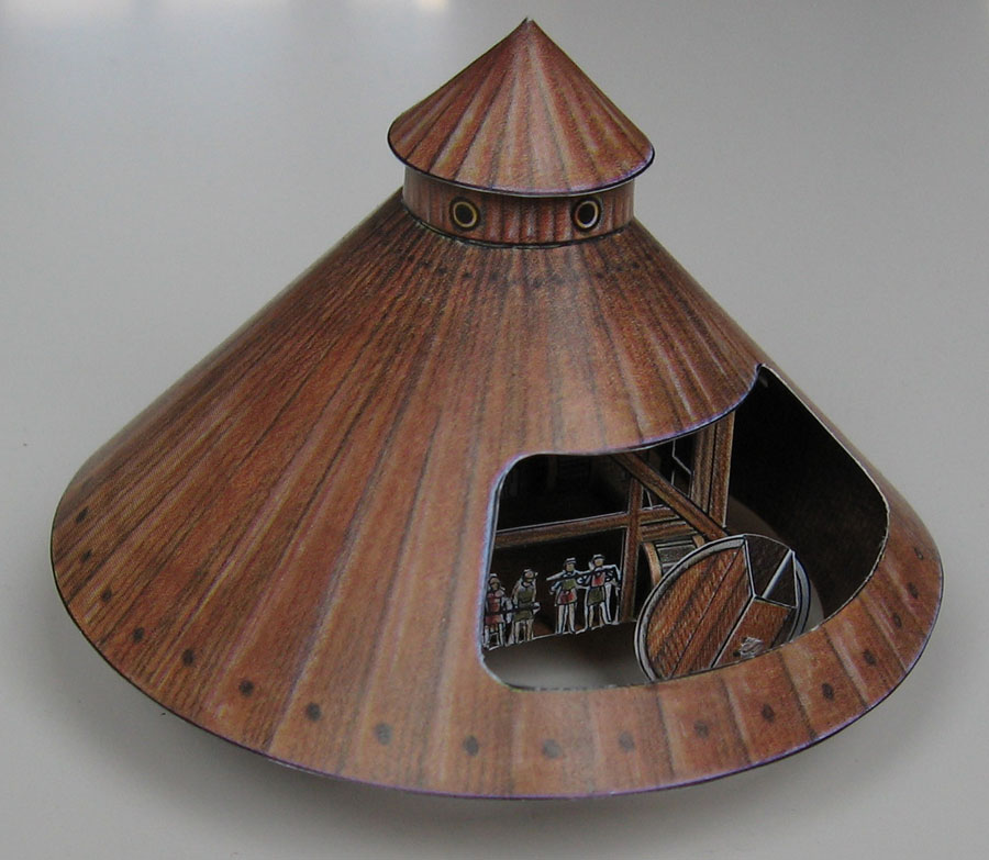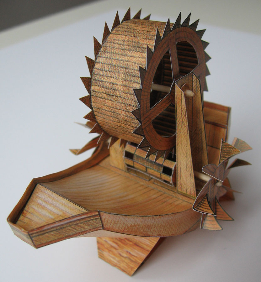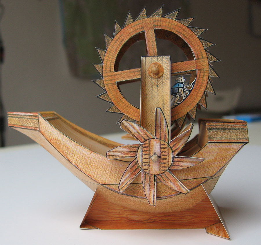 Here you can see the mechanical principle of the ship's propulsion system: Men walk in a treadmill wheel, and its rotation is transmitted to the paddlewheels by a simple (probably wooden) cogwheel.