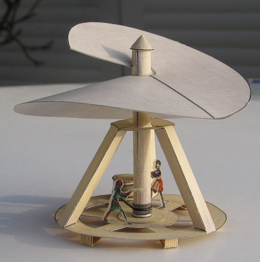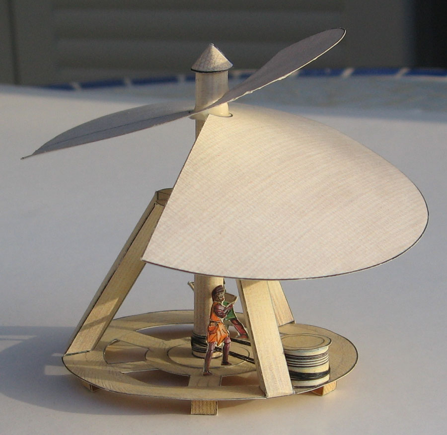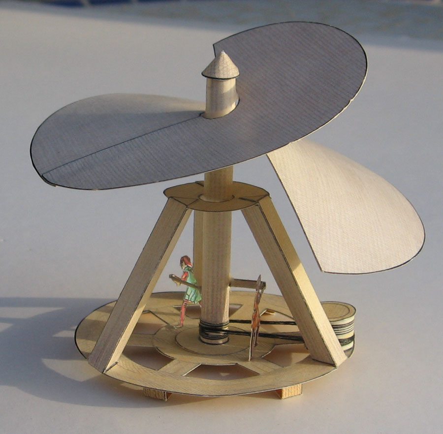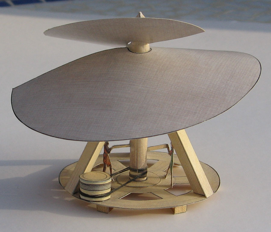This is a set of three small models showing three of Leonardo's "inventions" (if we may give that title to things that never were built, and never would have worked). Still, his was a very fertile mind that not only noticed (and annotated) the technical development of his time but that also was always thinking about the things that might come. The models are based on these sketches from da Vinci's notebooks: